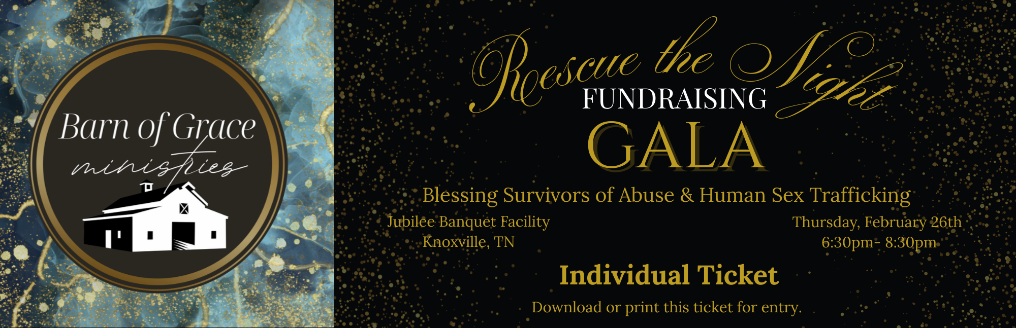 Join us for the Rescue the Night Gala, a night of elegance, purpose, and community impact. Your support helps Barn of Grace Ministries continue its mission of rescue and restoration. Choose from individual tickets or exclusive sponsorship opportunities that showcase your commitment to philanthropy while enjoying an unforgettable evening.